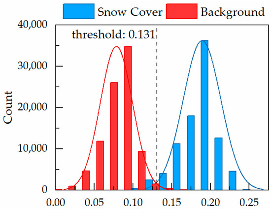 The separability between the snow cover and background is enhanced. The overall accuracy of classification can reach 98.34% when the segmentation threshold is set to 0.131. Overall, 2.67% of the snow cover samples and 0.64% of the background samples are misclassified with the optimal segmentation threshold, which is more satisfactory than the performance of the .