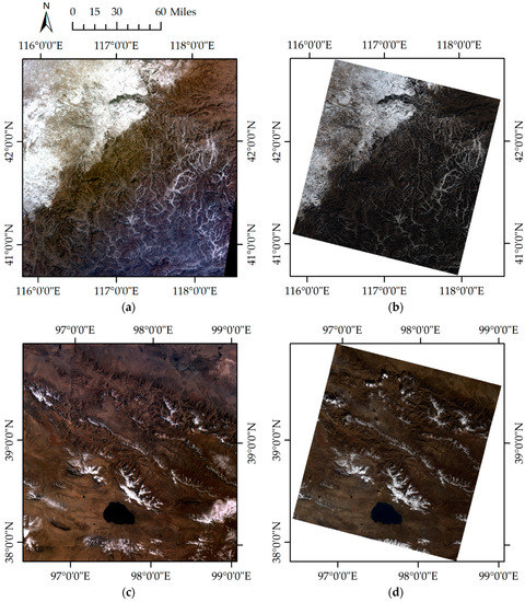 Figure 12 displays the green–red–blue (RGB) composite images of the overlapping regions between the PMS and OLI images. Table 4 presents the details of the two image pairs. The acquisition dates of the selected PMS and OLI images are as close as possible for each pair to reduce the temporal changes of snow cover and other land cover types. A snowfall occurred in the first test site on 12 December 2016. Most of the snow cover in the first test site belonged to the category of fine snow, as well as seasonal snow. No snowfall had occurred in the second test site before 15 October 2016. Most of the snow cover in the second test site belonged to the categories of medium and coarse granular snow, as well as perennial snow.