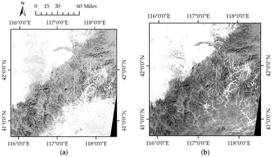 Distribution of snow cover mapped by the RSI method from the GF-4 PMS image: (a) test site No. 1; (b) test site No. 2. The two subfigures have the same north arrow, scale, and legend, which are marked on the upper part of the figure.