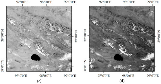 The GF-4 PMS surface reflectance images were processed according to the flowchart shown in Figure 11. The SWIR reflectance images were restored, and then the and RSI images were calculated. Figure 13 displays the results and the RSI results of the two test sites, respectively. By comparing the and RSI images, it can be found that the contrast between the snow cover and background is more significant in the RSI images than in the images. The cannot distinguish snow cover from bare land in the mountainous area in the southeast part of the first test site. For the RSI images, the contrast between snow cover and bare land in that area is more satisfactory, which indicates the necessity and effectiveness of the RSI method for snow cover monitoring from GF-4 PMS images.