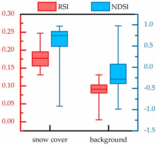 Distributions of the RSI and NDSI values of snow cover and background samples using box and whisker plots. The first and last horizontal lines of each box from top to bottom represent the maximum and minimum, respectively. The second, third, and fourth horizontal lines of each box from top to bottom represent the 25th, 50th (median), and 75th percentiles, respectively.