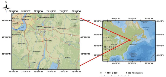 The study area lies in the Southern part of Saint-Jean-sur-Richelieu municipality, which is the regional capital of the Haut-Richelieu MRC, in the Montérégie administrative region of Quebec, Canada (Figure 1). This city occupies an area of 225.6 km and its population was estimated at 94,846 inhabitants in 2014. Most of the Saint-Jean-sur-Richelieu houses are located on both sides of the Richelieu River [30]. From late April to late June 2011, an unexpected overbanking flow of the Richelieu River occurred, and its magnitude exceeded all other extreme events recorded for at least 100 years in Quebec [31]. This disaster damaged around 2500 main homes in Montérégie. The river exceeded its bankfull discharge due to the combined effect of important snowmelt and extreme spring rainfall that reached approximately 320 mm between early April and late May 2011. The water level increased continuously to reach its peak on 6 May 2011. The maximum flow rate was 1550 m/s at the “Richelieu aux rapides Fryers” gauging station. On 22 June 2011, the water level of Richelieu River returned to its normal values below bankfull [32].