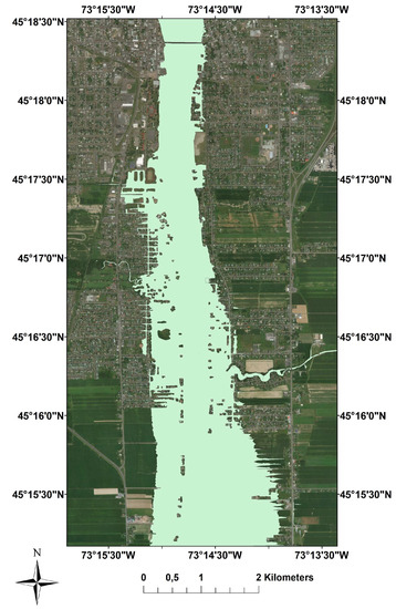 Over the past decade, inundations have accounted for of all climate-related disasters that have had severe environmental and social impacts worldwide [1]. During the period 1970–2014, the estimated flood costs in Canada represented about of the total amount provided by the Disaster Financial Assistance Arrangements (DFAA) [2]. From April to June 2011, a historic flood hit the Montérégie region of Quebec (Canada) and water reached record levels in the Richelieu River. The heavy spring snowmelt and the intense rainfall were the main causes of this unprecedented inundation. This unexpected natural disaster affected approximately 3927 people and 11 municipalities, and Montérégie declared a local state of emergency [3]. This shows that appropriate management approaches are necessary to minimize the social and economic losses due to floods. A relevant step in this process is to have access to reliable and precise information on the flood extent to execute the rescue activities effectively.