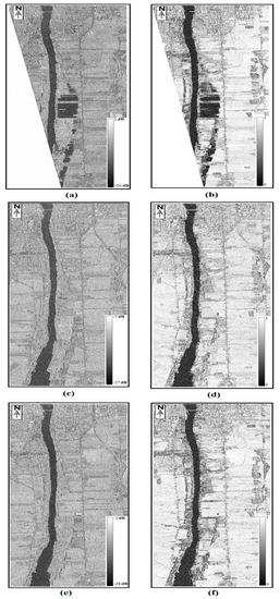 Left column: Intensity SAR Images, right column: bistatic TanDEM-X/TerraSAR-X InSAR coherence data (Color bars represent pixel values): (a,b) May 2011 (during the flood), (c,d) July 2011 (after the flood) and (e,f) August 2012 (after the flood).