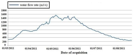 The hydraulic model set-up requires a set of topographic, bathymetric, and hydrometric data, namely a DEM of the floodplain, the riverstream bathymetry (i.e., riverbed geometry) and the boundary conditions [34]. In this study, the hydrometric information, namely the water level and the streamflow hydrograph, were acquired at the gauging station “Richelieu aux rapides Fryers” for a 6 months period (March to August 2011, see Figure 4). This time frame was chosen so that the model simulation starts at least one month before the beginning of the flood when the flow was still in the riverbed. Figure 5 indicates the position of the gauging station “Richelieu aux rapides Fryers”. Furthermore, a LiDAR DEM representing the topography of the floodplain in the study area and bathymetric data (dense sampling point cloud) was acquired using an echo-sounder.
