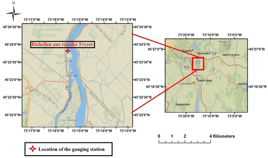Overall view of the study area and location of the gauging station “Richelieu aux rapides Fryers”.