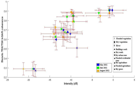 The general scatter plot with standard deviation error bars of multi-temporal SAR intensity and Bistatic InSAR coherence values for TanDEM-X/TerraSAR-X data.