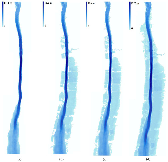 Temporal evolution of water depth as simulated using LISFLOOD-FP model: (a) 13 March 2011 (before the flooding), (b) 15 April 2011 (during the flooding), (c) 22 April 2011 (during the flooding), (d) 14 May 2011 (during the flooding).