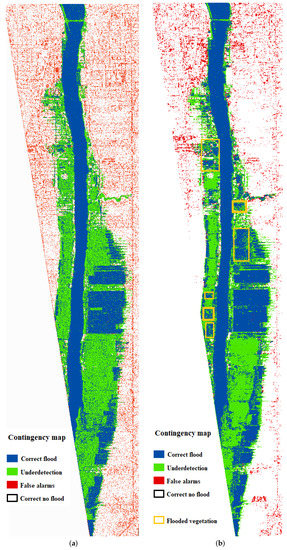 Contingency maps of the LISFLOOD-FP model-derived flood extent and the RF classification results that were created: (a) using only the multi-temporal TDX/TSX intensity (b) using the multi-temporal TDX/TSX intensity and bistatic TDX/TSX InSAR coherence.