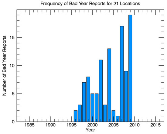 We began with initial diagnostics, first investigating our baseline observation of 21 villages in 2010. The participatory process identified the rough timing of Early June–July and late August–September as the vulnerable times for crops. These aligned with two categories of crops, short season and long season. These time periods roughly aligned with the sowing/establishment of the long season crops and the flowering/filling timing of both the long season and short season crops (which were not vulnerable to drought at the beginning of the season, because they are typically planted later). The bad years reported from the village discussion process are presented in Figure 2. Figure 3 presents the Heidke skill score, Peirce skill score, and equitable threat score of the seasonal timing of ARC2 data in predicting bad years reported by farmers for an array of decadal “windows”. The Heidke skill, Peirce skill, and equitable threat plots (Figures 3, 5 and 7) were used in order to show how temporal aggregation affects the agreement between rainfall during seasonal windows and farmer-perceived bad years. Areas with darker green indicate an increased number of “hits”, whereas purple indicates an increased number of misses. Plots are arranged with the starting dekad, or 10-day period, on the y-axis and the ending dekad on the x-axis.