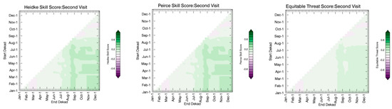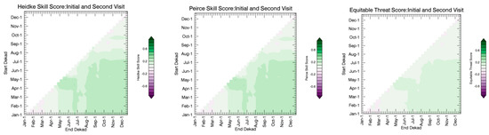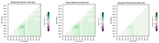 Heidke skill score, Pierce skill score, and equitable threat score for a variety of ARC2 rainfall accumulation intervals over the year. Higher skill scores reflect that the accumulation interval aligns better with farmer-identified payout years. The start and end dekads (on the y- and x-axis, respectively) indicate the 10-day period during the calendar that the accumulation calculation starts or ends. The lower-right portion of the graphic captures accumulation over the full calendar year, moving up from the lower right indicates a later start of accumulation, while moving to the left on the graphic represents an earlier end to the accumulation interval. Farmer-reported “bad years” in combined visit (1st and 2nd visit) to 21 villages in Tigray, Ethiopia, served as the truth data.