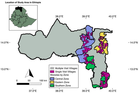 Similar to other studies, as part of the R4 index insurance design process, information on dry periods was collected using group meetings and linking climatic anomalies to events of importance in the communities [60]. This approach is referred to as “participatory design process”, which the International Research Institute (IRI) employs when it collects data and in the application of projects in the developing world. The data used from this suite of activities are referred to as “farmer bad years”, or historical years that farmers representing a particular community recall significant drought-related production losses for that community (not for a specific farmer). The participatory design process consisted of multiple visits to communities within a geographic area, and often multiple visits to the same community. Meetings with farmers used in order to provide the “farmer bad years” for the analysis in this study were conducted over a series of years in 81 villages that participate in the R4 index insurance program in Tigray, Ethiopia. These meetings were designed by local and international staff with experience in farmer reporting issues, and therefore included mechanisms to help address anticipated recollection and bias issues. The meetings involve formal mechanisms to improve representation across gender, ethnicity, age, wealth, land owners, laborers, and across agricultural crop and production types. Formal game exercises were played using drought events to assist with recall. The years of local, regional, and national events were noted and used to help people to recall the years of historical droughts. The farmer representatives were divided into groups. Farmers in each group were asked to recall and discuss the worst eight years for the community in terms of drought, going back to the beginning of the satellite rainfall data record, 1983 (see Table 1). The groups each reported the years they identified and reconciled differences together to arrive at a single list. We used the community perceptions of drought generated for the R4 project to provide a unique opportunity to understand how this related to other sources of information. This analysis used 81 total villages, out of which 21 were visited multiple times, allowing for temporal comparisons. Figure 1 shows the locations of each of the years that have representative farmer perception data.