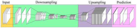 The CNNs are composed by a sequential hierarchy of processing layers displayed in Figure 2. From the input to the final classification layer, the data pass through a series of trainable units. The architecture contained down-sampling, up-sampling, and prediction layers, which is described in detail in Volpi et al. [8]. The topmost layer, which is a prediction layer, is composed by a classifier. We used the commonly employed multinomial logistic regression, whose scores (class-conditional probabilities) are given by the SoftMax function: