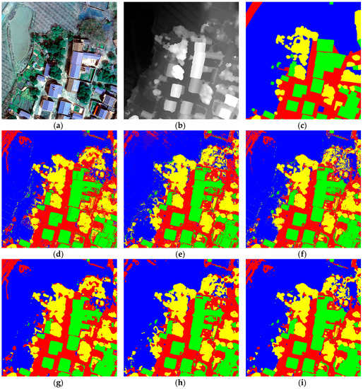 Classification results of LULC classification dataset in rural areas of Wuhan city. (a) remote sensing image; (b) NDSM; (c) ground truth; (d) SD-SVM classification; (e) FCNN-SVM classification; (f) CMP -SVM classification; (g) SD-FCCRF classification; (h) FCNN-FCCRF classification; (i) CMP-FCCRF classification (C1 Red: impervious surfaces; C2 Green: homestead; C3 Blue: background; C4 Yellow: trees).