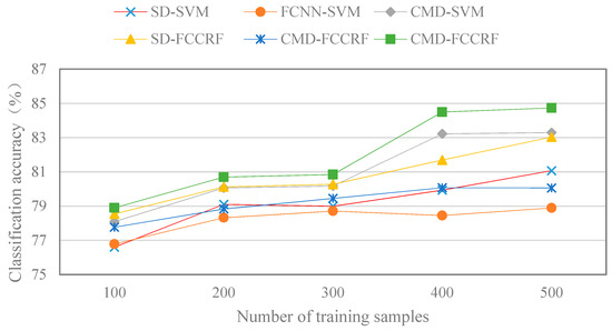 As shown in Figure 5, the classification accuracy of CMP-FCCRF initially increased for the data sets with the gradual increase in the number of training samples per class (from 78.9% to 84.73%). The classification accuracy of CMP-FCCRF was slightly higher than CMP-SVM (78.09% and 83.29%, respectively) classification approaches with LULC classification dataset in rural areas of Wuhan city. The classification accuracy of the proposed method remained higher than the other five methods for each training number. The training samples were randomly selected from the overall ground truth, and the remaining samples were used to evaluate the classification accuracies. The experiments showed that the classification accuracies of the methods incorporating spatial contextual information (i.e., SD-FCCRF, FCNN-FCCRF, and the proposed CMP-FCCRF) were all better than SVM-based classification methods. Moreover, the CMP-FCCRF method was more robust than the other classification methods for different training samples.