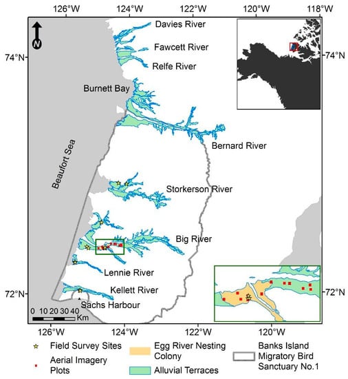The river valleys of western Banks Island are important breeding habitat for many migratory bird species, including the lesser snow goose. This habitat supports over 95% of the western Arctic lesser snow goose population. The main nesting colony of this population is located at the confluence of the Egg and Big rivers [,] (Figure 1). The Banks Island Migratory Bird Sanctuary No. 1 is the second largest bird sanctuary in Canada at 20,517 km2, and was created to protect this colony [,].