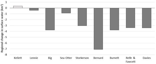 Between 1985 and 2015, the alluvial terraces of western Banks Island lost 33.3 km2 of surface water and gained 3.9 km2 of surface water, resulting in a net loss of 29.3 km2, or 7.9% of the original surface water (Figure A1, Figure A2 and Figure A3). Regional SWF trends indicate that surface water has declined in all river valleys except the Kellett (Figure 2). The Bernard River valley lost the largest absolute area of surface water (8.83 km2) and the Relfe-Fawcett River valley lost the highest proportion of original surface water (17.1%).