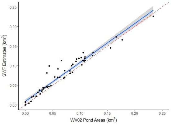 The sum of sub-pixel water fraction pixel values plotted against the sum of the area of manually-delineated waterbodies within 500 m2 plots. The blue line represents the model predictions (SWF estimates ~ WV02 Pond Areas), the grey bar represents the 95% confidence interval, and the dotted red line shows a 1:1 relationship.