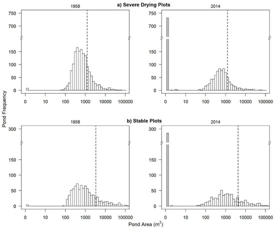 In stable and severe drying plots, there was an increase in the mean size of waterbodies present in 2014 (Figure 4), which is indicative of a disproportionate loss of small waterbodies. The change in mean waterbody size between 1958–2014 was considerably smaller in severe drying plots (Δ 9.4 m2), compared to stable plots (Δ 876.9 m2), which showed a more balanced loss of waterbodies of varying sizes.