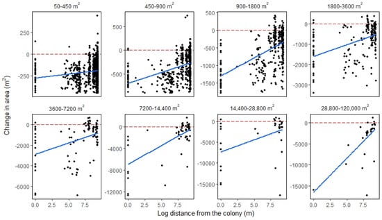 Visualization of the interaction effect (distance from the colony and waterbody size) in the best model (Table 4). Data were divided based on the waterbody size classes indicated above each panel. Each point represents the change in area of a single waterbody. The blue lines show model predictions for waterbody area change within that size class. The dotted red reference lines show no change in waterbody area.