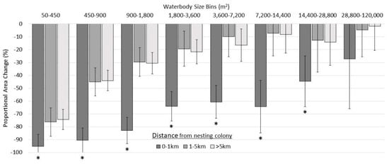 All waterbody size classes, except the largest (>28,800 m2), had significantly greater proportional area loss (p < 0.05) within 1 km of the nesting colony, compared to waterbodies between 1–5 km and further than 5 km from the nesting colony (Figure 6). At distances greater than 1 km from the nesting colony, waterbodies showed similar proportional changes in all size classes. Regardless of distance from the colony, the smallest waterbody size class had the largest proportional area loss at 95.3% +/− 9.2 for 0–1 km from the nesting colony, 76.3% +/− 11.1 for 1–5 km, and 74.4% +/− 7.8 for greater than 5 km.