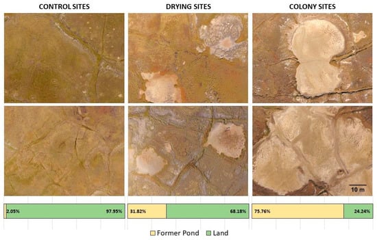 Aerial photographs captured using an unmanned aerial vehicle (UAV) during July 2017 field surveys. The bars below the images show the proportion of field transects classified as former pond basins and regular land.