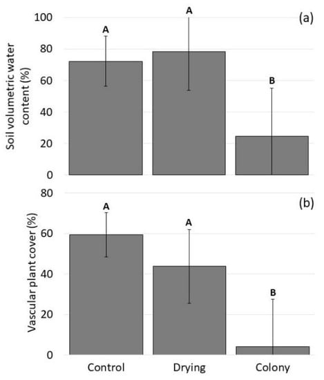 Least-squares means estimates of (a) soil volumetric water content and (b) vegetation cover from the linear mixed effects models. Error bars represent 95% confidence intervals and bars with different letters are significantly different.