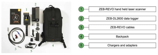 The WMLS tested in the case study was the ZEB-REVO, commercialized by GeoSLAM (Figure 1) [34], which consisted of a 2D time-of-flight laser scanner (Hokuyo UTM-30LX-F from Hokuyo Automatic Co., Osaka, Japan) rigidly coupled to an IMU mounted on a rotary engine. The motion of the scanning head on the motor drive was stored in a processing unit located in a small backpack and provided the third dimension to generate 3D information. This computer was equipped with batteries that fed the hand-held laser scanner through a special connection cable. A 3D SLAM algorithm was used to combine the 2D laser scan data with the IMU data, in order to return accurate 3D point clouds, following the full SLAM approach implemented in the robotic operative system (ROS) library [35]. With a 360° vertical field of view and 30 m of range in ideal indoor conditions (which was reduced to 15–20 m in real working circumstances), the operator moved through the indoor environment capturing more than 43,000 points per second. Regarding accuracy, the manufacturer declared that its value is 1–3 cm in relative terms and 1–30 cm in absolute positioning for a 10-min scan, with the closing of a single loop [34]. Table 1 shows further technical specifications.