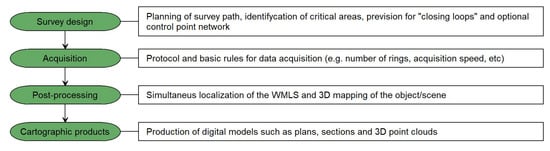 In this regard, it is possible to identify a succession of methodological phases that characterize an inspection with this approach: (i) the survey design (planning of the path); (ii) the data acquisition (protocol and basic rules); (iii) the post-processing (SLAM algorithm to compute the sensor trajectory and map the environment); and (iv) the cartographic product generation (three-dimensional and two-dimensional digital models). Figure 2 outlines the main steps of the applied methodology.