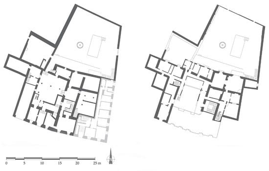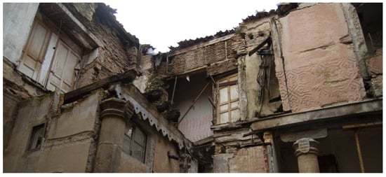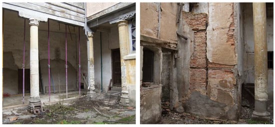 With the aim of evaluating the potentialities and limitations of the WMLS technology, we selected a gothic palace in ruins, located in the urban center of Segovia (Castile and León, Spain), as a case study (Figure 4). The palace was erected in the 15th century as a consequence of the economic expansion experimented by the city, following the precepts of the civil plateresque architecture [39]. Its fronts are made of sandstone masonry and brick masonry. They stand out for their horizontality, showing a ratio height/width of 1/2. With respect to the inner composition, the construction shows the characteristic appearance of the palaces erected during this epoch, with two annular traces in the two first plans and an inner cloister in the center of the construction [39]. These elements are integrated on five levels: (i) basement; (ii) ground floor; (iii) mezzanine; (iv) first floor and; (v) gallery (maybe added during the XIX century), filling an area of about 3000 m2 and holding more than 50 rooms. The internal courtyard is characterized by a front porch that transfers part of its weight to the masonry and partly to stone columns with granite base (Figure 5).