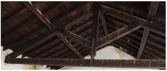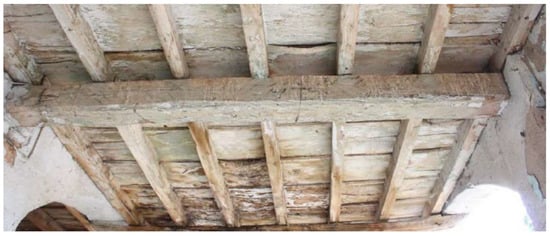 Timber slabs and open-node (Figure 6) trusses complement these masonry elements. The wooden floors are present both in the simple form, with single beams, and in the form composed of double row of beams and overlapping joists (Figure 7). The secondary frame is made up of a wooden plank in which a conglomerate jet has been made; it is composed of fine aggregates and mortar with a watering function and a thickness of a few centimeters. The finish provides the substrate and the relative flooring.