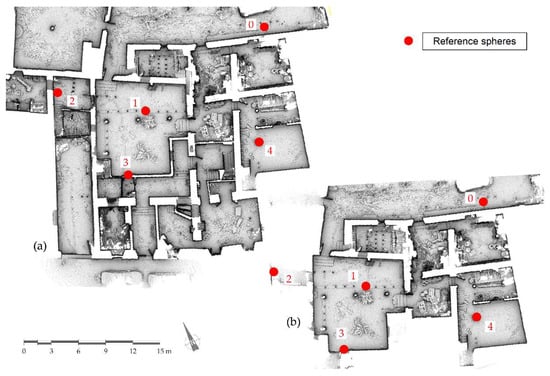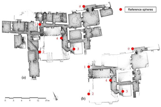 In order to perform the alignments between the different paths, a network of artificial targets (spheres) wa distributed around the cloister and on the internal and external facades (Figure 10) (Figure 11). The use of spheres was not mandatory for the execution of the alignment, but this approach made it possible to analyze the registration error between the different paths. The centroids of homologous spheres, extracted by means of the RANSAC Shape Detector algorithm [41] were used as reference pairs. The error associated with the pairs was quantified through the discrepancy in the overall coordinate system between the spatial coordinates of the two homologous centroids (located in two different paths). The root mean square error (RMSE) of the whole registration was just over 3 cm for all the alignment processes achieved (a value perfectly compatible with the WMLS accuracy).