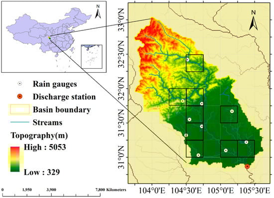The Fujiang River basin, with a drainage area of 24,752 km2 above the Shehong hydrological station, is the largest tributary of the right bank of the Jialing River that is the largest branch of the Yangtze River. It is located within 30°50′N–33°24′N and 103°45′E–105°38′E in southeast China (Figure 1). Surrounded by high mountains in the upstream and dominated by low hills in the middle part, the topography of Fujiang River basin is complex, with elevations ranging from 300 to 5000 m. Soils in the basin are mainly composed by purple soil (30%), yellow-brown soil (30%) and paddy (14%) according to the China soil classification system [37].