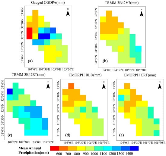 Spatial maps of mean annual precipitation over Fujiang River basin for the period of 2006–2013, from (a) gauge observations, (b) TRMM 3B42V7, (c) TRMM 3B42RT, (d) CMORPH BLD and (e) CMORPH CRT.