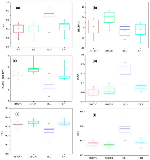 Figure 4 shows box plots of grid-scale statistics for different precipitation products at daily timescale. As shown in Figure 4, CMORPH BLD performed best among the different products with CC ranging from 0.66 to 0.94, RMSE ranging from 2.84 mm/day to 6.90 mm/day and ETS ranging from 0.41 to 0.70, although it had greater dispersion in terms of POD and ETS compared with other products. Apart from the remarkable overestimation of 3B42RT with average BIAS of 19.11%, the average BIAS values of the other products were within ±10%, which coincides with the results of previous studies [35,36].
