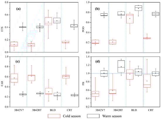Box plots of grid based metrics in cold and warm seasons for different precipitation products at daily timescale from 2006–2013: (a–d) represents ETS, POD, FAR and FB, respectively.