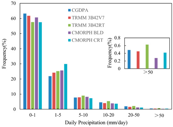 Figure 6 shows the frequency distribution of gauged and satellite-based daily precipitation at different rainfall ranges from 2006 to 2013. As witnessed in Figure 6, about 60% daily precipitation fell within the range of 0–1 mm/day, whereas heavy precipitation (>20 mm/day) accounted for only about 3%. All the satellite precipitation products tended to underestimate light rainfall (0–1 mm/day) and moderate to heavy precipitation (>10 mm/day) except 3B42RT, but overestimate daily precipitation at the rates from 1 to 10 mm/day. CMORPH BLD showed good agreement with the reference data in slight and moderate precipitation (0–20 mm/day). Apart from 3B42RT, the other three products tended to underestimate heavy and torrential rain events (>20 mm/day). In conclusion, both 3B42V7 and CMORPH BLD reproduced the frequency distribution of various precipitation intensities fairly well, especially for light precipitation, while 3B42RT deviated most significantly from the observed frequencies.