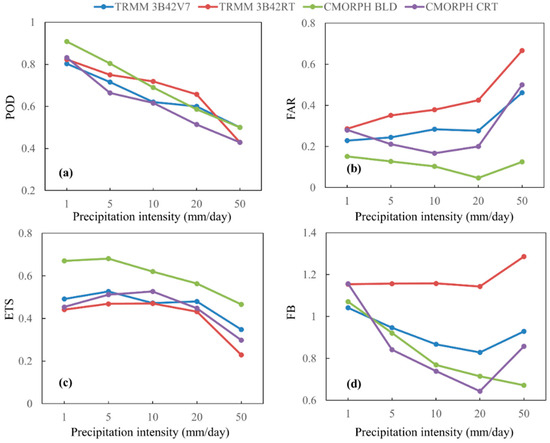 Figure 8 presents the results of four metrics (POD, FAR, ETS and FB) at different precipitation thresholds. The results shows that the overall accuracy of all the products declined (POD and ETS were reduced and FAR was increased) with increasing rainfall rate, which indicated the limited capability of satellite sensors for depicting intense precipitation [54]. In contrast, according to FAR, CMORPH BLD performed best with a more stable discrimination skill across all the thresholds. Moreover, CMORPH BLD was superior to other products with the highest ETS and POD for rainfall rates of 1 mm/day, 5 mm/day and 50 mm/day. The performance of TMPA products was comparable, while CMORPH CRT performed worst based on most metrics, particularly in FB. The underestimation in CMORPH products for medium and heavy rainfall could be attributed to the limited GTS reports used in error correction (Figure 8d).