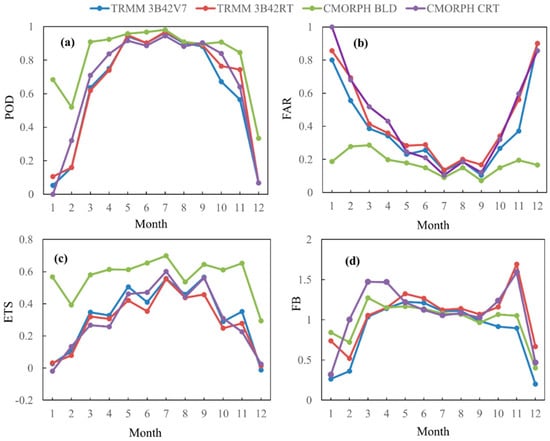 Generally, CMORPH BLD was more suitable for characterizing the seasonal variation of precipitation, with its performance far more than other products in winter. In contrast, CMORPH CRT performs worst in winter with almost no detection skills (POD = 0, FAR = 1, ETS < 0 in January), suggesting the advance of OI algorithm applied in CMORPH BLD. In terms of FB, all the products tended to overestimate precipitation that spreads over two peaks in spring and autumn, but underestimated precipitation in winter.