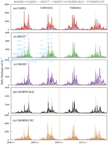 Comparison of observed and simulated daily discharge in Scenario I from (a) CGDPA, (b) 3B42V7, (c) 3B42RT, (d) CMORPH BLD and (e) CMORPH CRT in both calibration (2008–2009) and validation (2010–2011) periods.