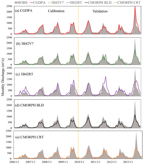 Comparison of observed and simulated monthly discharge in Scenario I from (a) CGDPA, (b) 3B42V7, (c) 3B42RT, (d) CMORPH BLD and (e) CMORPH CRT in both calibration (2006–2009) and validation (2010–2013) periods.