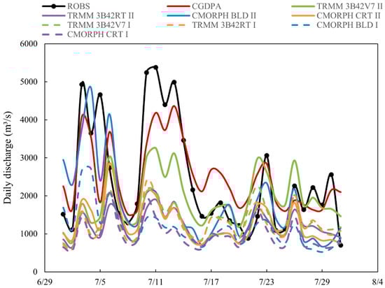 For the 4–7 July flood period, all the satellite products forced simulation under two scenarios slightly delayed the flood peaks. This is mainly attributable to the inherent deficiencies of satellite precipitation products [18]. Despite missing the first flood event, 3B42V7-driven simulation in scenario II (solid lines) reasonably reproduced the magnitude and key pattern of the other two flood events. For the period of 10–16 July, 3B42V7 recalibrated simulations captured the flood event to some extent, whereas other simulations failed to detect the flood event, which can be inferred from the incorrect precipitation distribution of the torrential rainfall on 10–16 July, which has not been captured well by other satellite products (Figure 6). There is a large drop of simulated discharge for the late July flood period (17–31 July). This may be caused by the emergency flood relief by local government [32].