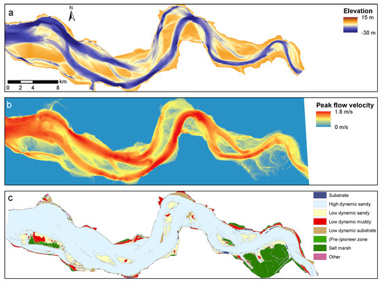(a) bathymetry of the Western Scheldt in 2012 from the mouth (left) to the Dutch-Belgian border (right); (b) peak tidal flow velocities from a calibrated hydrodynamic model of Rijkswaterstaat (SCALWEST, [32]) for the bathymetry of the Western Scheldt in 2009 and (c) ecotope map of the Western Scheldt (2012). Bathymetry, hydrodynamic output and ecotope map were obtained from Rijkswaterstaat.