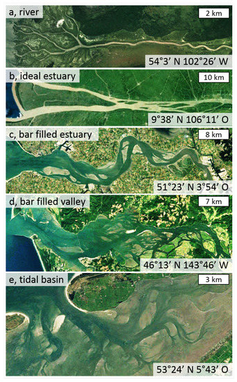 Here, existing empirical relations and theoretical concepts were selected and combined in a fast-to-apply tool that predicts equilibrium morphology and hydrodynamic conditions. To assess the applicability, we test it against a range of estuaries and other end-member systems, characterised by varying degrees of tidal and river influence [9,26] as well as varying degrees of adaptation to boundary conditions [9,27] and varying degrees of bar presence (Figure 2). These systems are a river-dominated delta branch [26], a tide-dominated delta branch (an ideal estuary cf. Savenije [18]), an alluvial estuary filled with tidal bars [19,26], a relatively wide estuarine valley partially filled with bars [26,28], and a tidal basin lacking fluvial input [29,30,31] (Figure 2). In the discussion, we show applications for management of estuaries, palaeogeographic reconstructions and quantifying habitat area based on species-specific preferences.