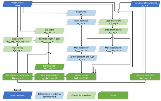 In order to be able to use additional data when available, we allow some variables to override estimations by the above relations (Figure 3). Specifically, measured maximum mouth depth and maximum depth at the upstream boundary make their estimation based on tidal prism and hydraulic geometry redundant. A specified depth and width at the upstream boundary implicitly impose a user defined hydraulic geometry. Similarly, measured fresh water discharge may override the estimation of discharge based on channel width, which replaces the high uncertainty of the empirical relation with the lower measurement uncertainty. Finally, salinity at the mouth and landward boundary may be specified instead of the default values of 35 ppt at the mouth and 0 ppt at the landward boundary.