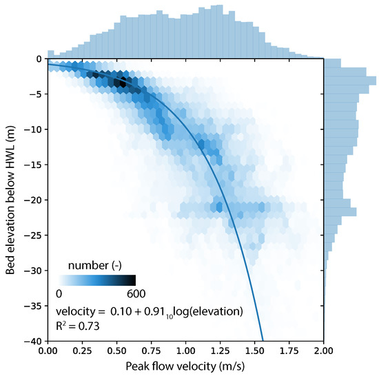 A relation for typical flow conditions as a function of estuarine geometry was still lacking. Therefore, we explored this relation in a calibrated hydrodynamic model of Rijkswaterstaat (SCALWEST, [32]) for the bathymetry of the Western Scheldt in 2009. We hypothesised that a relation would exist between bed elevation and typical flow velocity (Figure 1b). Peak tidal flow velocity () indeed showed a good correlation () with depth below high water level (Figure 4):