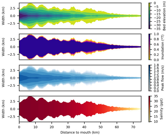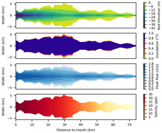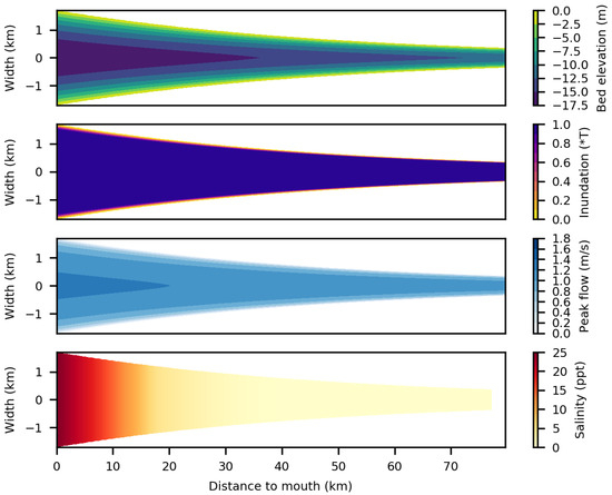 The tool output comprises maps of predicted bed elevation with respect to the high water level (HWL), relative inundation duration, flow velocity and salinity (Figure 5 and Figure 6). In general, the bed deepens in seaward direction. At locations where the estuary is relatively wide, average bed elevations are higher and at locations where the estuary width is close to the ideal width, bed elevations are lower (Equations (4) and (5)). Zones where the excess width is large are the locations where stretches of intertidal area are wider and where inundation durations are less than 100%. Peak flow velocities increase in seaward direction with maxima around 1.8 ms at the mouth. Peak flow velocities in the intertidal area are generally below 0.8 ms. The salinity gradually decreases in landward directions and approaches river salinity at the landward boundary.