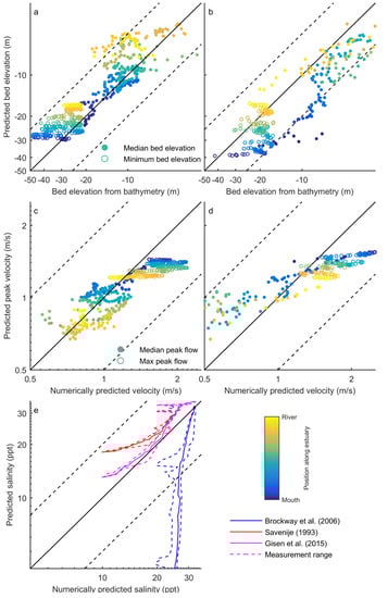 (a,b) predicted bed elevations against measured bed elevations taken from bathymetry for the Western Scheldt (a) and Columbia River (b); (c,d) predicted flow velocity from the tool against modelled flow velocity for numerical models of the Western Scheldt (c) and Columbia River (d). Filled circles indicate median values per cross-section, open circles indicate maximum values per cross-section. Dashed lines indicate a spread of a factor 2 around the line. Colours indicate the position along the estuary, with blue being the mouth and yellow being the most landward location; (e) predicted salinity for the three predictors against measured salinity in the Western Scheldt. Solid lines indicate mean measured salinity per transect against predicted salinity and dashed lines indicate maximum and minimum measured values.