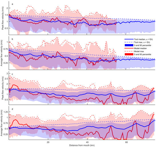 The range of predicted flow velocities is generally in the same range as the modelled values for both the peak and average flow velocities (Figure 7c,d). However, the along-channel variation in minimum and maximum flow velocities is larger for the models than for the tool output (Figure 8). We explain this by a simplification of some morphological elements in the tool. For example, the presence and location of scours and sills, which cause variation in the along-channel maximum depth, is not predicted by the tool. However, they do occur in natural systems and therefore also cause variations in along-channel flow velocity pattern. In the tool, the profile of maximum depth is linear along-channel, which results in lower variations in the maximum flow velocity. Nevertheless, the velocity predictions do capture the along-channel variability caused by the large-scale morphological variation in bed elevation, as illustrated with the median values per transect (Figure 8).