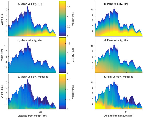 Before, we had to estimate a typical peak flow velocity because it was required for the estimation of the tidal excursion length (Equation (9)). At that point, a value of 1 ms was assumed [18]. This assumption only partly influences the output flow velocity, which depends on bed elevation, which in turn is controlled by the estuary planform shape, the tidal range and the tidal excursion length. Nevertheless, output maps justify the assumption of 1 ms for the purpose of calculating the tidal excursion length. The average peak tidal flow velocity is 1 ms for the Western Scheldt and 1.2 ms for the Columbia River when averaged over the surface area of a typical tidal excursion length (Figure 5 and Figure 6). Median values of peak tidal flow velocity per transect are also remarkably close to the typical value proposed by Savenije [18] along the entire estuary (Figure 7a,c).